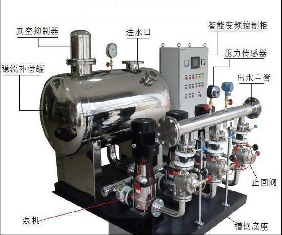 WB型無負壓變頻穩(wěn)流供水設備由變頻控制柜、穩(wěn)流罐、氣壓罐、水泵機組、儀表、閥門、管路機組等組成、適用于具有自來水管網(wǎng)、需要增高水壓的給水系統(tǒng)。